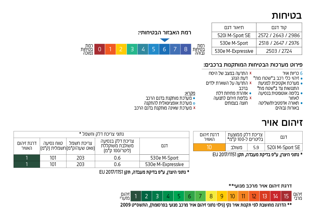 BMW 530e sDrive [1]: Fuel consumption, combined WLTP in l/100 km: 0.8–0.6; CO2 emissions, combined WLTP in g/km: 19–14; Energy consumption, combined WLTP in kWh/100 km: 21.4–18.9; Electric range, WLTP in km: 87–102